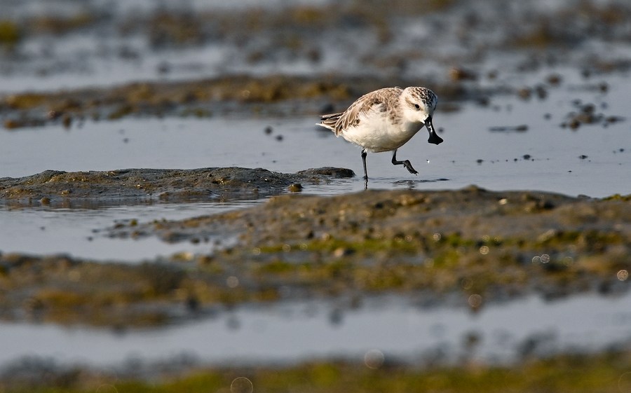 A spoon-billed sandpiper forages at Xinyingwan mangrove nature reserve in Danzhou, south China's Hainan Province, Jan. 19, 2021. (Xinhua/Yang Guanyu)