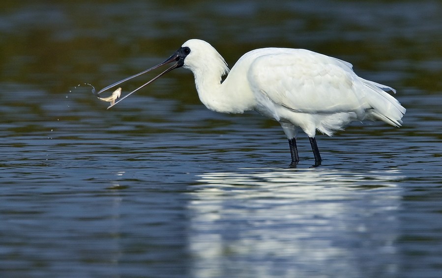 A black-faced spoonbill forages in Panshan Village of Xinzhou Town in Danzhou City, south China's Hainan Province, Jan. 19, 2021. (Xinhua/Yang Guanyu)