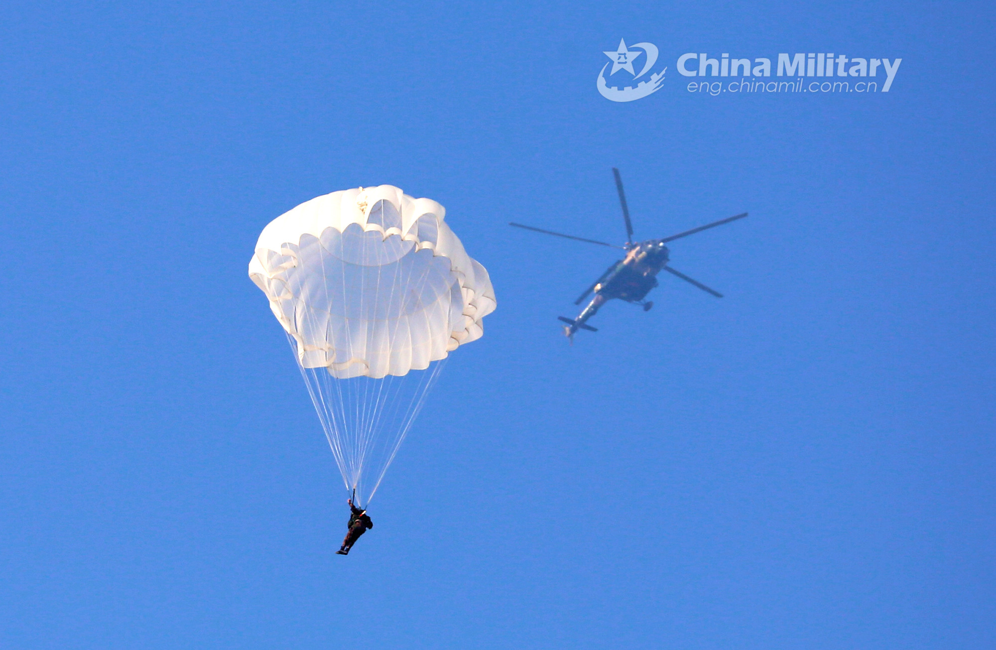 Paratroopers assigned to an army aviation brigade under the PLA 72nd Group Army descend to the drop zone after jumping from a Mi-171 transport helicopter during a parachute training exercise on November 27, 2021. (eng.chinamil.com.cn/Photo by Zhang Huanpeng)