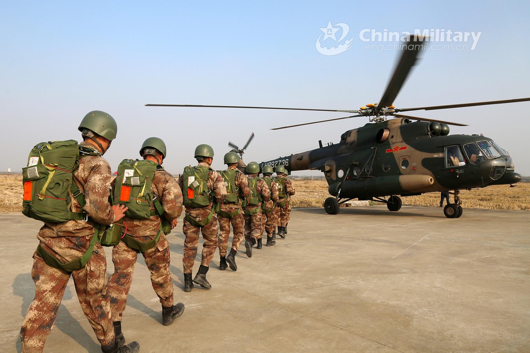 Soldiers assigned to an army aviation brigade under the PLA 72nd Group Army queue to board a Mi-171 transport helicopter for a parachute training exercise on November 27, 2021. (eng.chinamil.com.cn/Photo by Zhang Huanpeng)