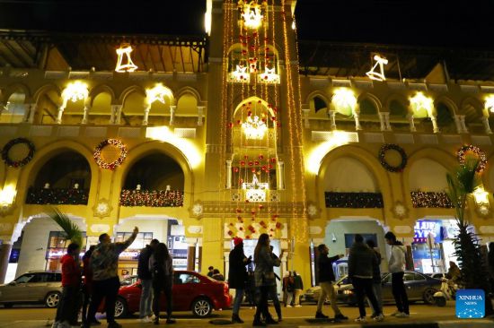 People take photos in front of a building with Christmas decorations in Cairo, Egypt, on Dec. 25, 2021. (Xinhua/Ahmed Gomaa)