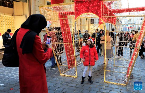 Light installations are seen at a Christmas market in downtown Beirut, Lebanon, on Dec. 25, 2021. (Xinhua/Liu Zongya)