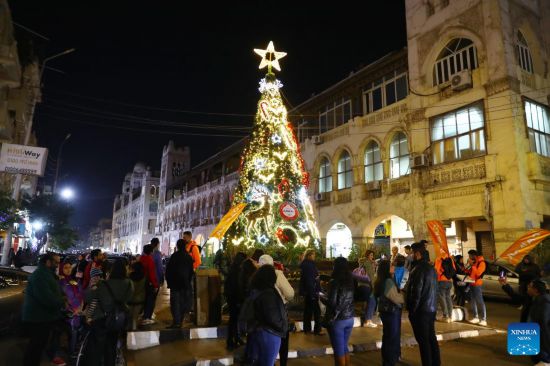 People gather around a Christmas tree in Cairo, Egypt, on Dec. 25, 2021. (Xinhua/Ahmed Gomaa)