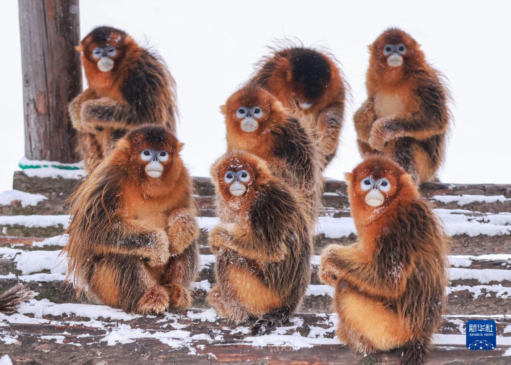 Photo taken on Dec. 26, 2021 shows golden-haired monkeys resting in the snow at a zoo in Rongcheng, east China's Shandong Province. (Xinhua/Li Xinjun)