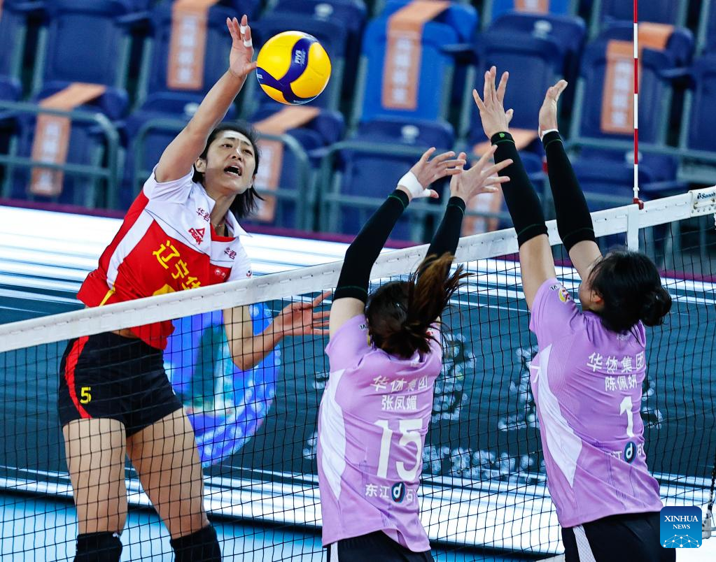 Shi Bingtong (L) of Liaoning spikes during the Group E match between Liaoning and Guangdong at the second stage of the 2021-2022 season Chinese Women's Volleyball Super League in Jiangmen, south China's Guangdong Province, Dec. 27, 2021. (Xinhua/Yang Zhisen)