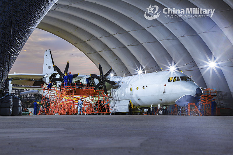 Maintenance men assigned to an aviation division with the PLA Navy perform inspections on an anti-submarine patrol aircraft in the hangar in late December. (eng.chinamil.com.cn/Photo by Zhang Dingyi)