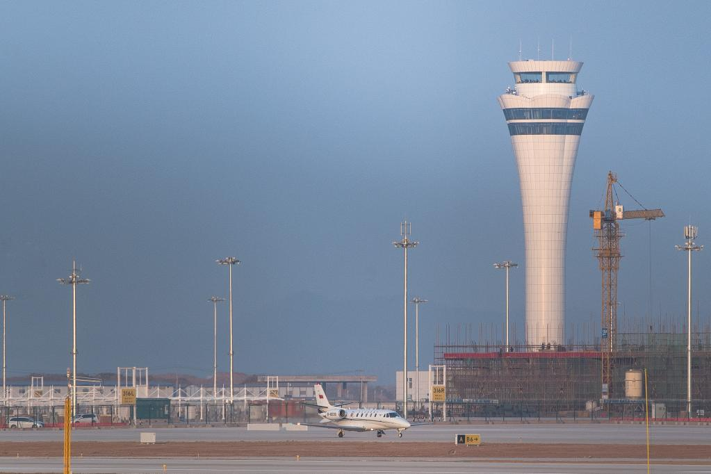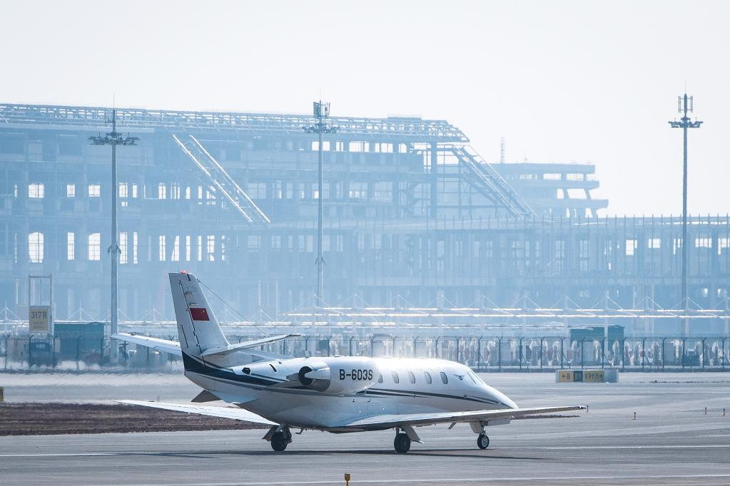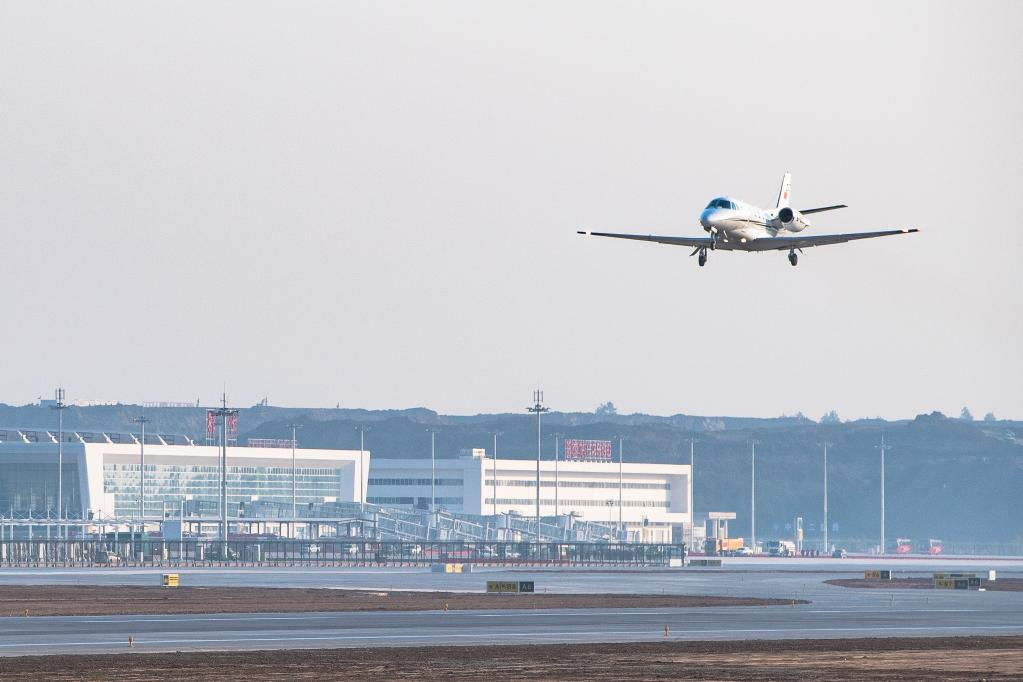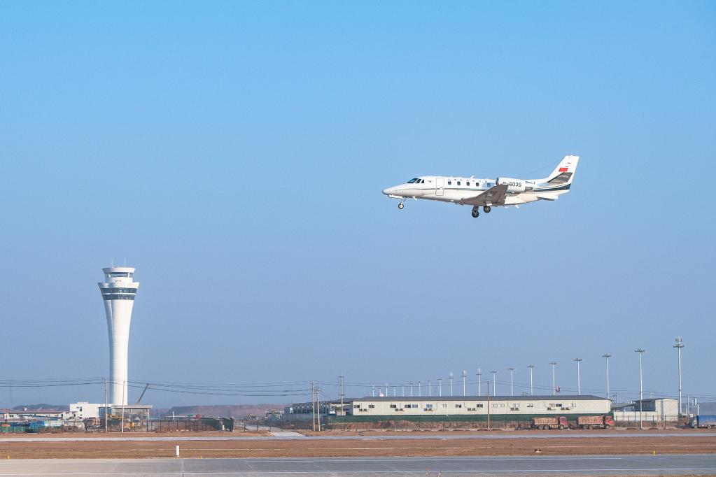 A Cessna 560 airplane lands at the Ezhou Huahu Airport in Ezhou, central China's Hubei Province, Dec. 29, 2021. A Cessna 560 carried out flight verification of the Ezhou Huahu Airport on Wednesday, marking the completion of the cargo-oriented airport. The airport is the country's first cargo airport, with the functional orientation of the air cargo hub and feeder airport for passenger transport. It is also China's first airport project that introduces social capital and enterprises. (Xinhua/Xiao Yijiu)