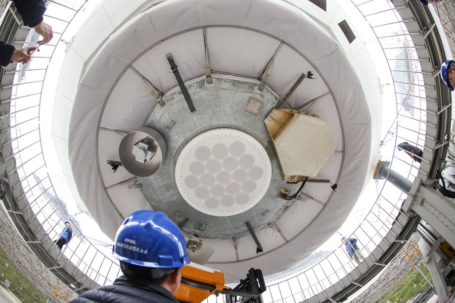 Photo taken on Dec. 19, 2021 shows China's Five-hundred-meter Aperture Spherical Radio Telescope (FAST) under maintenance in southwest China's Guizhou Province. (Xinhua/Ou Dongqu)
