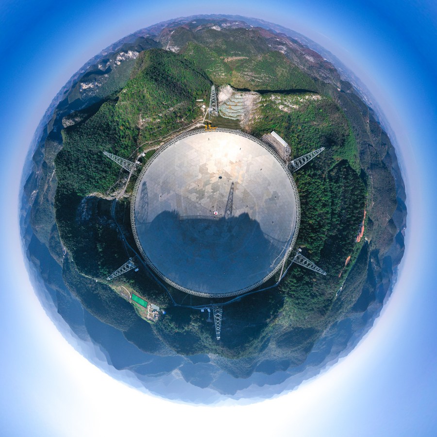 Aerial photo taken on Dec. 19, 2021 shows a panoramic view of China's Five-hundred-meter Aperture Spherical Radio Telescope (FAST) under maintenance in southwest China's Guizhou Province. (Xinhua/Ou Dongqu)