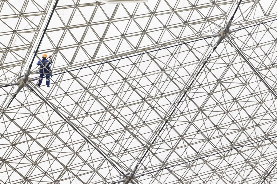 A staff member conducts maintenance work at China's Five-hundred-meter Aperture Spherical Radio Telescope (FAST) in southwest China's Guizhou Province, Dec. 17, 2021. (Xinhua/Ou Dongqu)