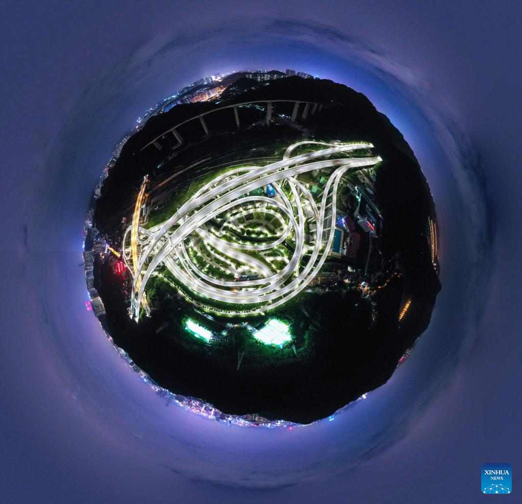 Aerial panoramic photo taken on July 21, 2021 shows the night view of the Qianchun overpass in Guiyang, southwest China's Guizhou Province. (Xinhua/Yang Wenbin)