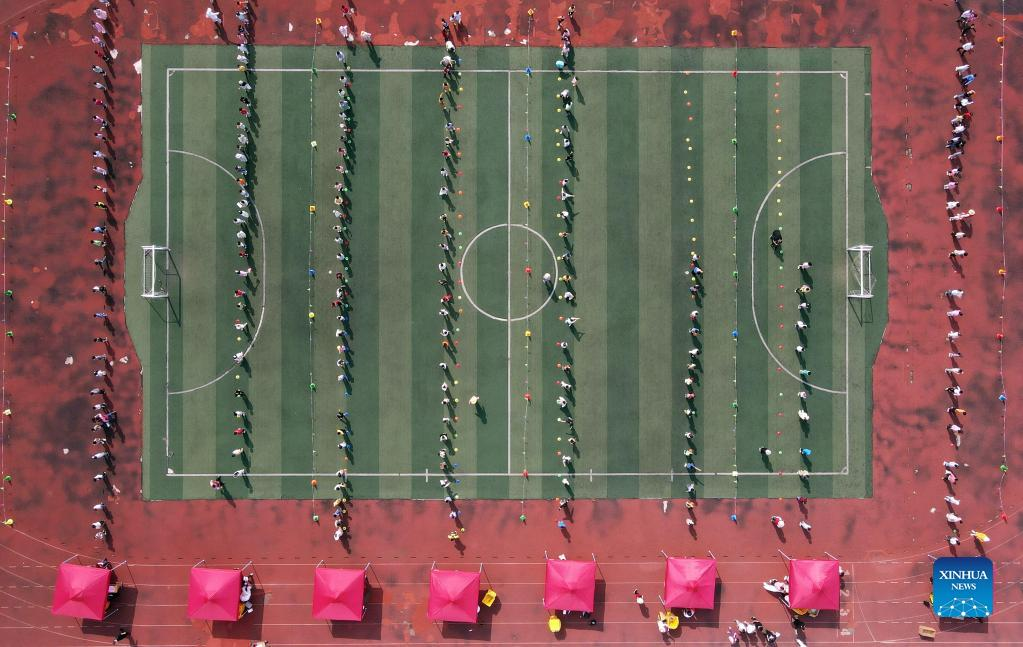 Aerial photo shows students queuing up to take swab samples for nucleic acid testing at a primary school in Lu'an, east China's Anhui Province, May 22, 2021. (Xinhua/Zhou Mu)