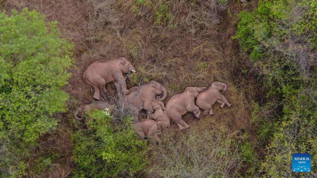 Aerial photo taken on June 7, 2021 shows wild Asian elephants in Jinning District of Kunming, southwest China's Yunnan Province. (Xinhua)