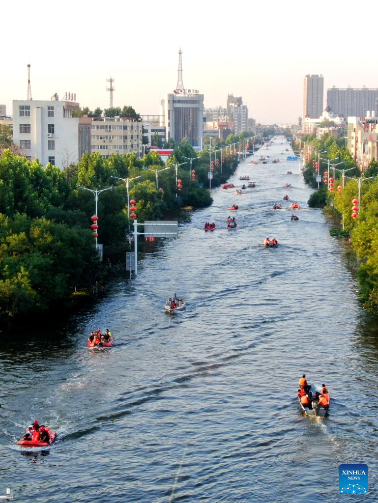 Aerial photo taken on July 26, 2021 shows rescue boats in the waterlogged urban area of Weihui City in Xinxiang, central China's Henan Province. Weihui City suffered from severe urban waterlogging due to the extremely heavy rainfall. (Xinhua/Hao Yuan)