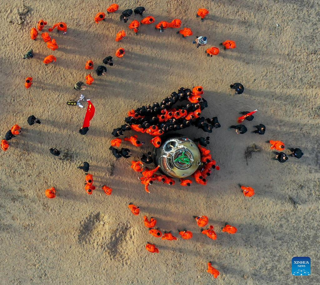 In this aerial photo, staff members surround the return capsule of the Shenzhou-12 manned spaceship, which landed successfully at the Dongfeng landing site in north China's Inner Mongolia Autonomous Region on Sept. 17, 2021. (Xinhua/Lian Zhen)