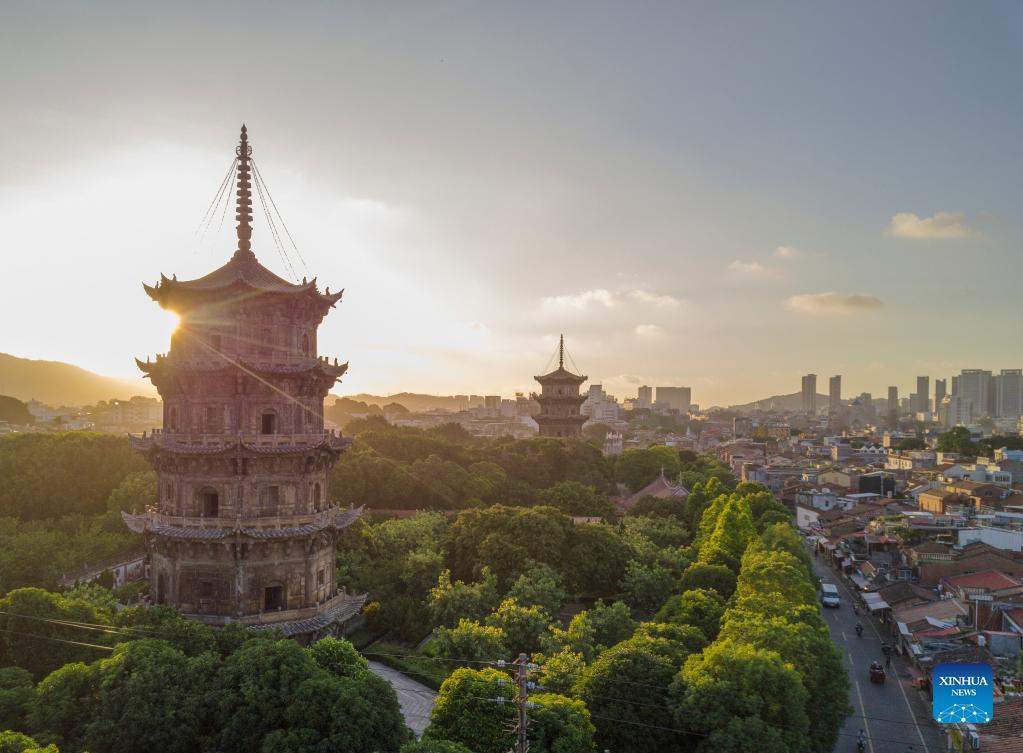 Aerial photo taken on July 8, 2021 shows the east and west pagodas of Kaiyuan Temple and the surrounding core area for ancient city conservation in Quanzhou, southeast China's Fujian Province. On July 25, 2021, UNESCO accepted "Quanzhou: Emporium of the World in Song-Yuan China" as a cultural property on its World Heritage List amid the 44th session of the World Heritage Committee held in Fuzhou, capital city of Fujian Province. (Xinhua/Song Weiwei)