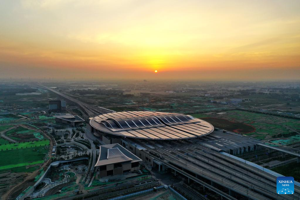 Aerial photo taken on July 1, 2021 shows the Xiong'an Railway Station at sunrise in Xiong'an New Area, north China's Hebei Province. (Xinhua/Mu Yu)