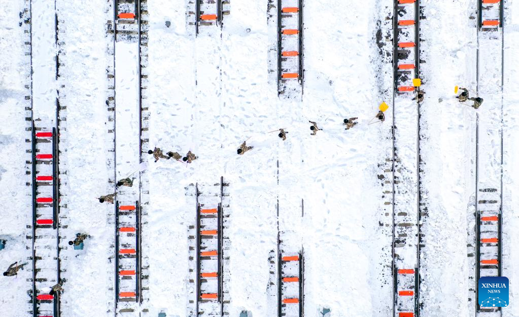 Aerial photo taken on Nov. 11, 2021 shows soldiers of the armed police force removing snow from the rail tracks in Tongliao, north China's Inner Mongolia Autonomous Region. (Xinhua/Lian Zhen)