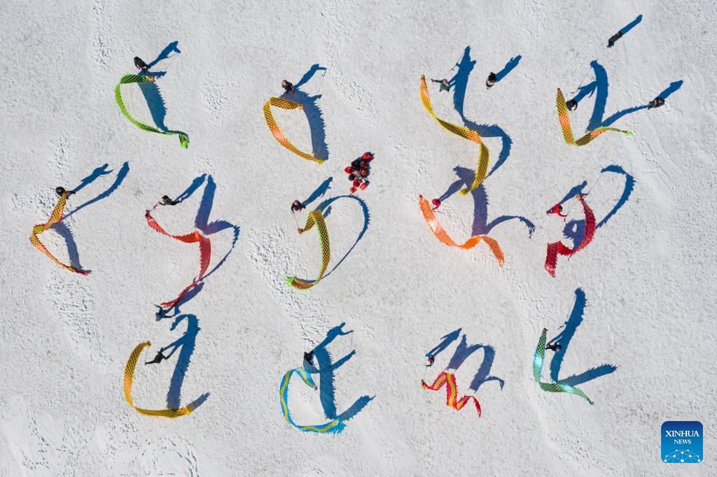 Aerial photo taken on March 6, 2021 shows local residents practicing ribbon dance at a sports park in Hegang City of northeast China's Heilongjiang Province. (Xinhua/Xie Jianfei)