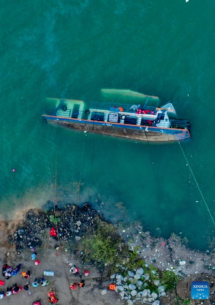 Aerial photo taken on Sept. 19, 2021 shows rescuers working at the site where a passenger ship overturned in Zangke Township of Liupanshui, southwest China's Guizhou Province. (Xinhua/Ou Dongqu)