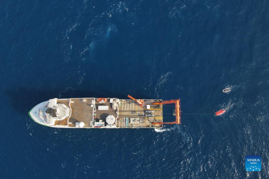 Aerial photo taken on April 16, 2021 shows the deep-sea manned submersible Shenhai Yongshi (Deep Sea Warrior) and its mother ship Tansuo-2. (Xinhua/Zhang Liyun)