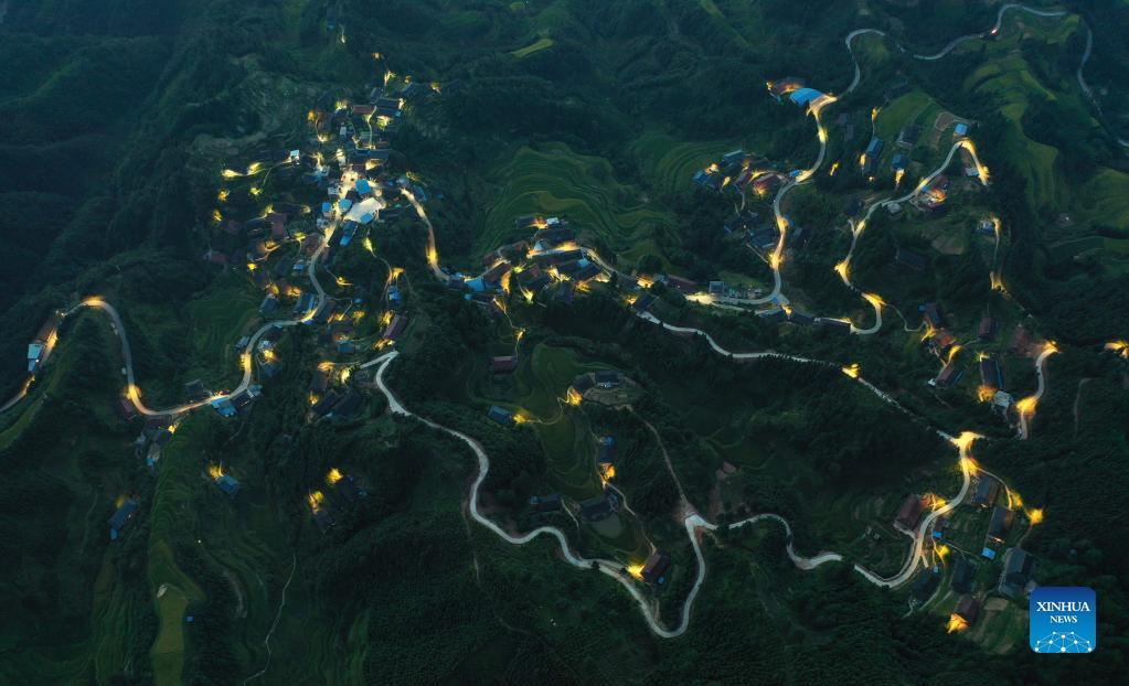 Aerial photo taken on Aug. 25, 2021 shows the night view of Dangjiu Village in Rongshui Miao Autonomous County, south China's Guangxi Zhuang Autonomous Region. (Xinhua/Huang Xiaobang)
