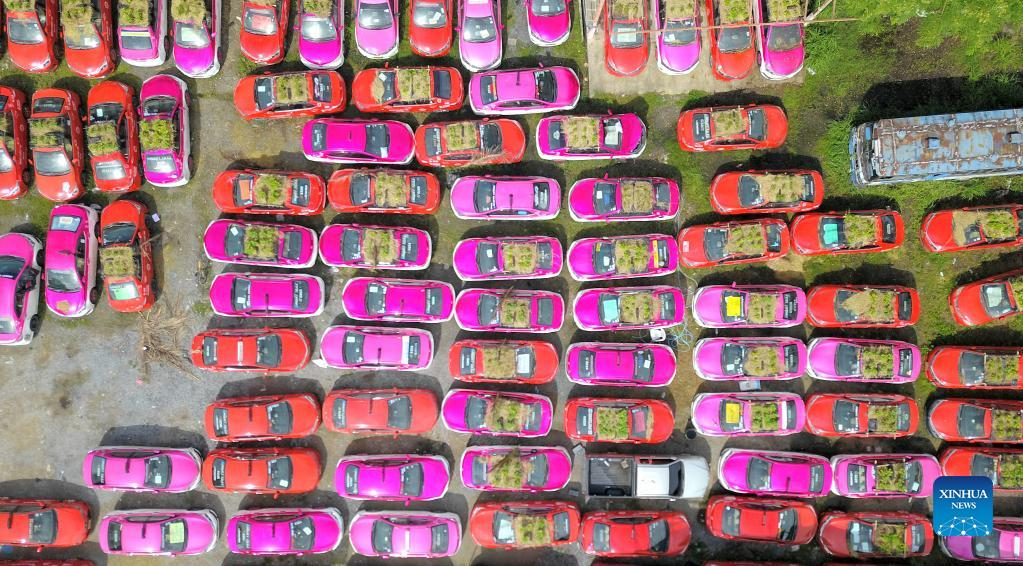 Aerial photo taken on Sept. 24, 2021 shows taxis used to grow vegetables at a parking lot in Bangkok, Thailand. At the parking lot on the outskirts of Bangkok, hundreds of taxis were out of service for more than a year due to the COVID-19 epidemic. Taxi company staff piled soil on the roof and hood of these cars to grow vegetables and distributed them to employees and unemployed drivers. (Xinhua/Wang Teng)