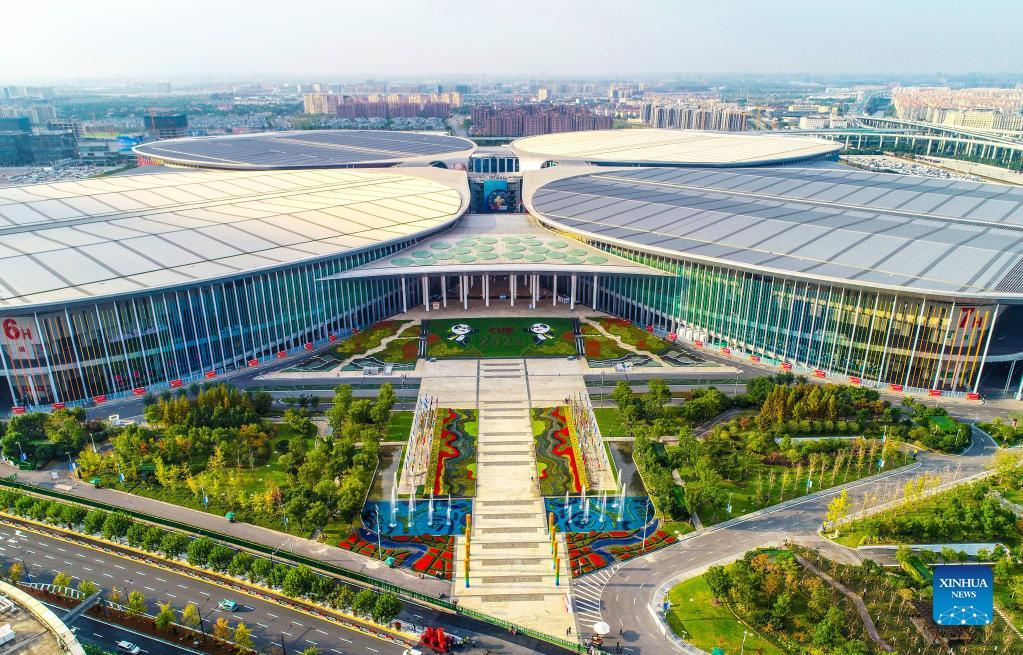 Aerial photo taken on Oct. 31, 2021 shows the National Exhibition and Convention Center in east China's Shanghai. (Photo by Jiang Zhongcheng/Xinhua)