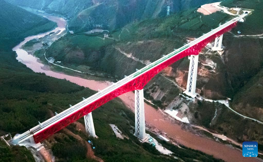 Aerial photo shows an electric multiple unit (EMU) train of the China-Laos Railway crossing a major bridge over the Yuanjiang River in southwest China's Yunnan Province, Dec. 3, 2021. (Xinhua/Wang Guansen)