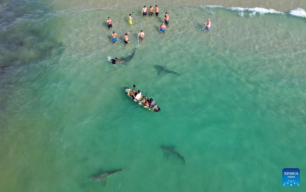 Aerial photo shows people bathing near sharks in the Mediterranean Sea off the coast of northern Israeli city of Hadera on April 20, 2021. (Photo by Gil Cohen Magen/Xinhua)