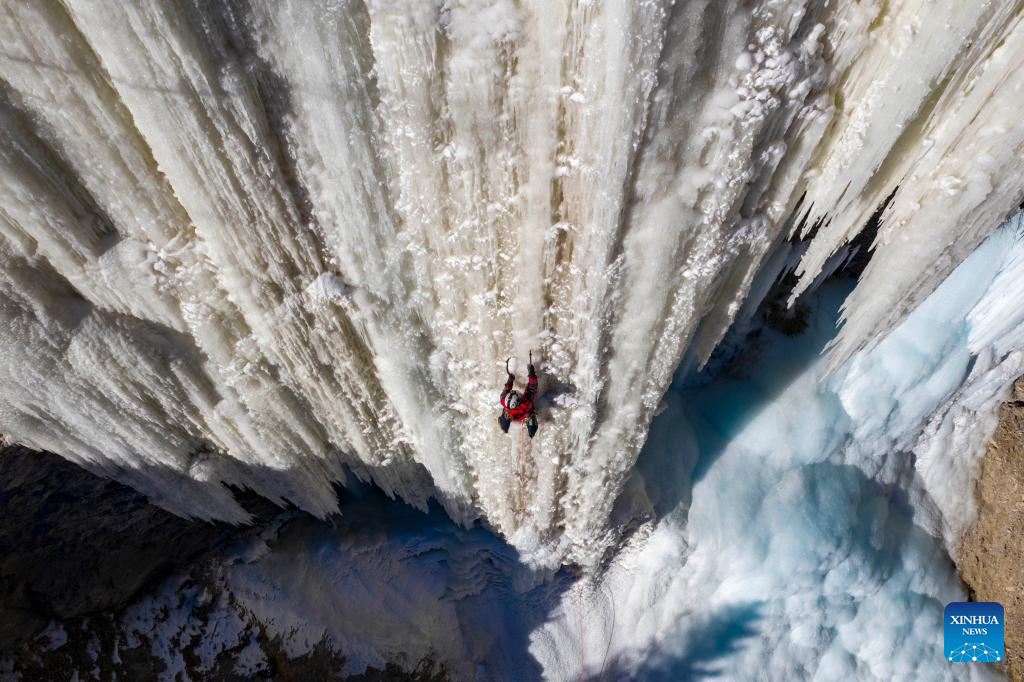 Aerial photo taken on Jan. 16, 2021 shows Huang Huang, an ice climbing amateur, practicing ice climbing in Urumqi, northwest China's Xinjiang Uygur Autonomous Region. (Xinhua/Hu Huhu)