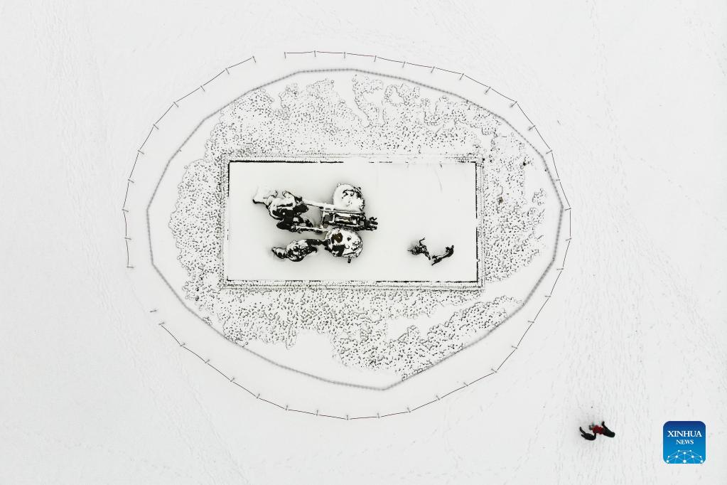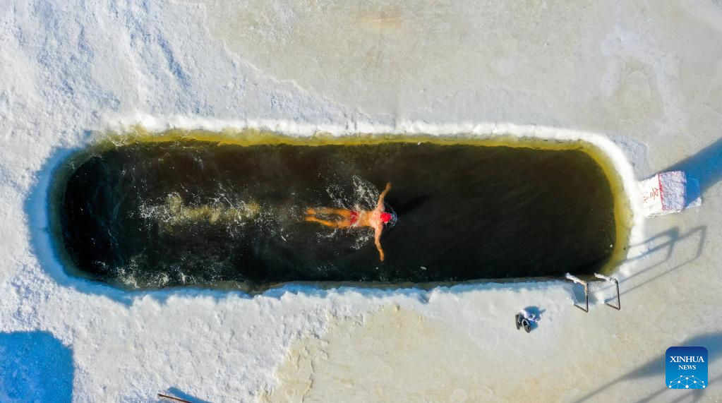 Aerial photo taken on Jan. 22, 2021 shows local resident Yan Xiangbin enjoying outdoor swimming in winter season in Hailar District of Hulun Buir, north China's Inner Mongolia Autonomous Region. (Xinhua/Liu Lei)