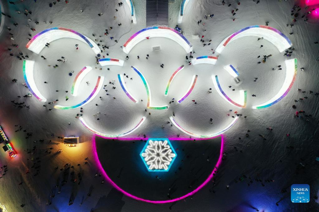 Aerial photo taken on Dec. 25, 2021 shows tourists visiting the Harbin Ice-Snow World in Harbin, northeast China's Heilongjiang Province. (Xinhua/Xie Jianfei)