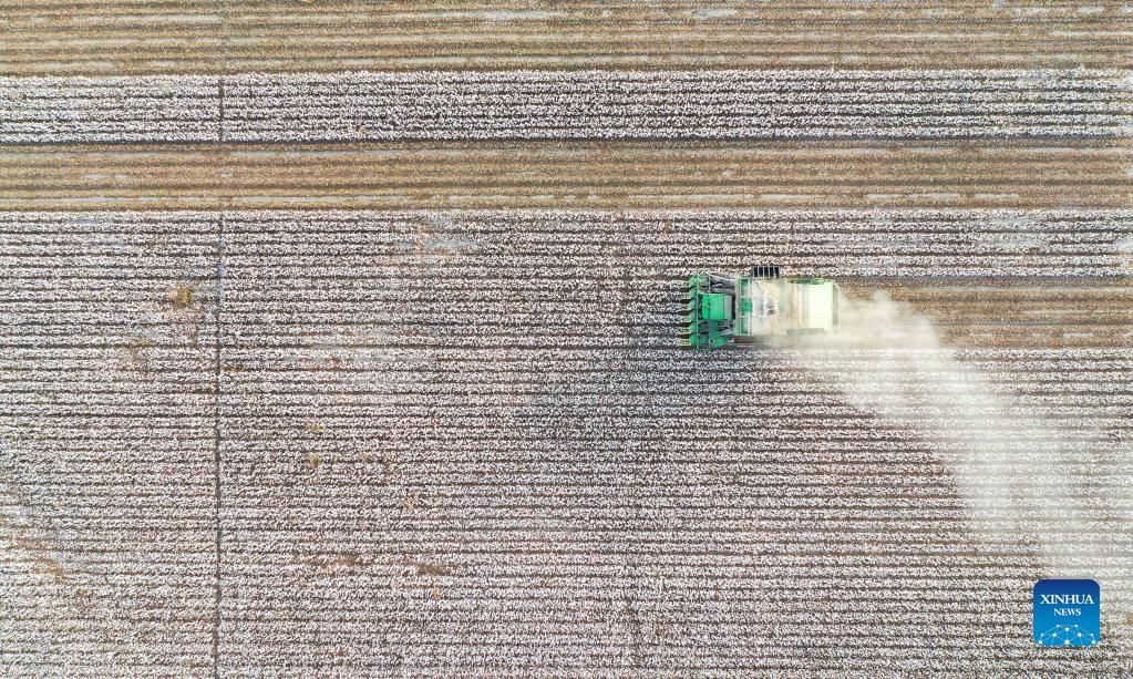 A cotton picker works in the fields at Yuli County, northwest China's Xinjiang Uygur Autonomous Region, Oct. 24, 2021. (Xinhua/Zhao Ge)