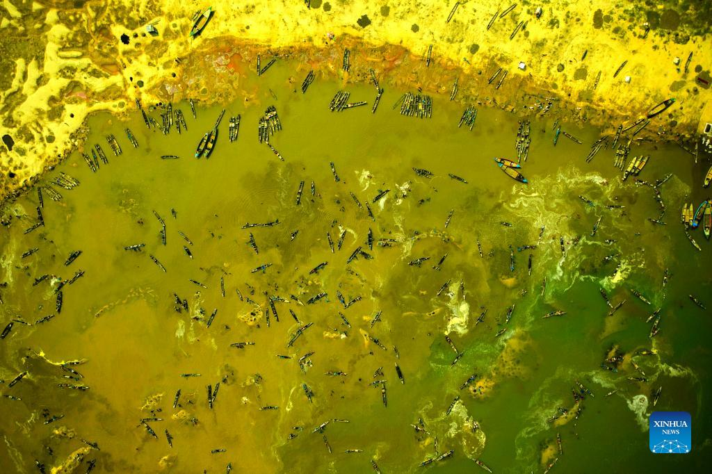 Aerial photo taken on Oct. 24, 2021 shows a view of a quarry in the Jadukata river in Sunamganj, Bangladesh. (Photo by Salim/Xinhua)