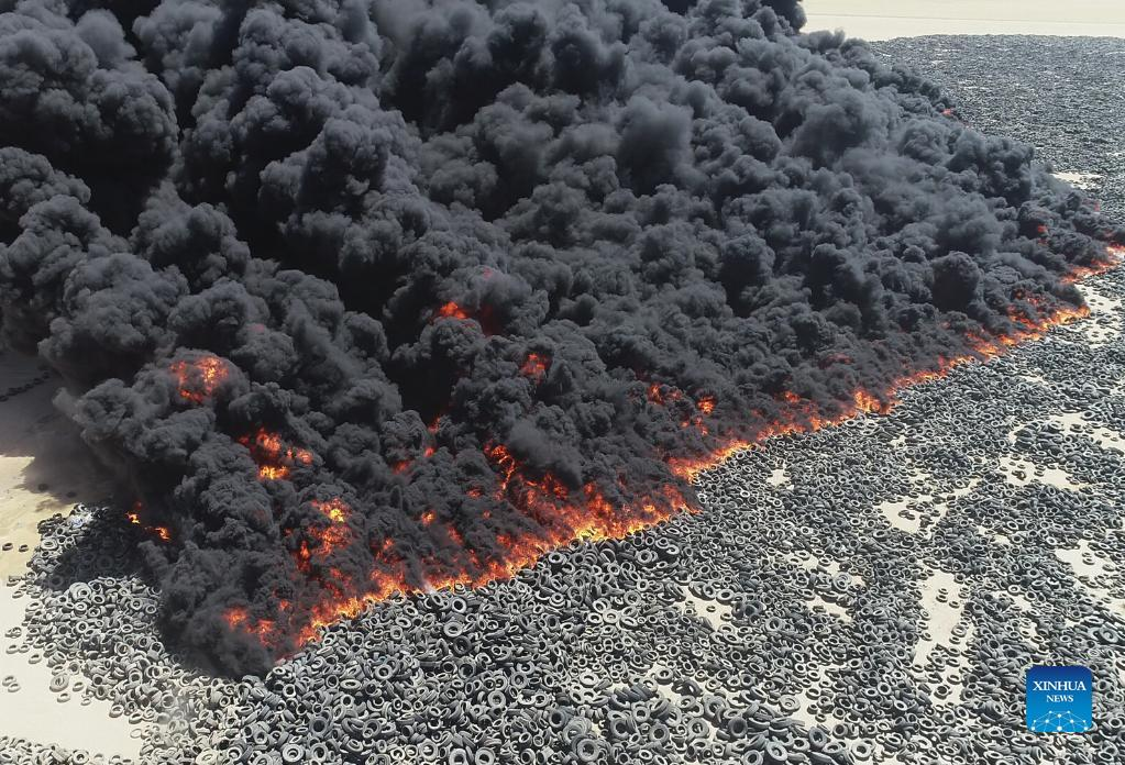 Aerial photo taken on April 29, 2021 shows fire at a tire yard in Jahra Governorate, Kuwait. (Photo by Asad/Xinhua)