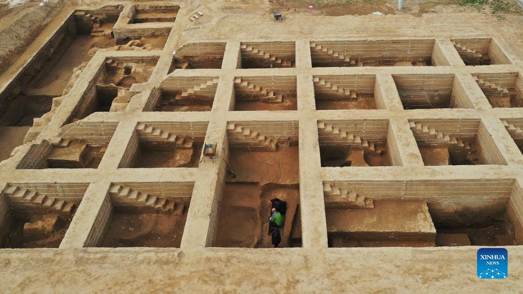 Aerial photo taken on March 19, 2021 shows staff working at the excavation site of Nanyang ancient site in Xiong'an New Area, north China's Hebei Province. (Xinhua/Mu Yu)