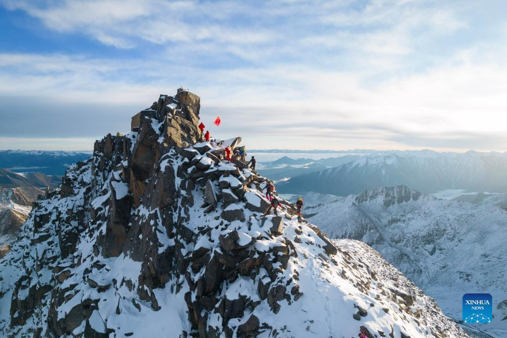 Aerial photo taken on Oct. 30, 2021 shows people climbing a mountain in Aba Tibetan and Qiang Autonomous Prefecture, southwest China's Sichuan Province. (Xinhua/Jiang Hongjing)