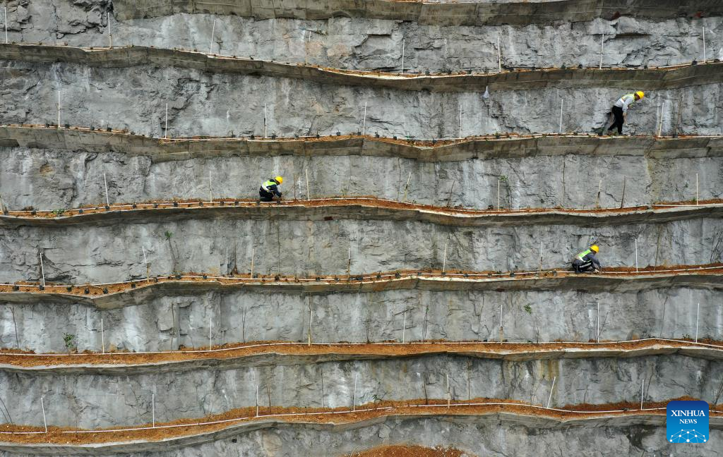 Aerial photo taken on March 22, 2021 shows workers at the a construction site on Louti Mountain in Liuzhou City, south China's Guangxi Zhuang Autonomous Region. (Photo by Li Hanchi/Xinhua)