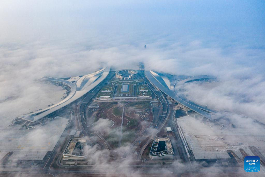 Aerial photo taken on April 12, 2021 shows the Chengdu Tianfu International Airport in Chengdu, southwest China's Sichuan Province. The airport has opened for operations on June 27, 2021. (Photo by Wang Ruilin/Xinhua)
