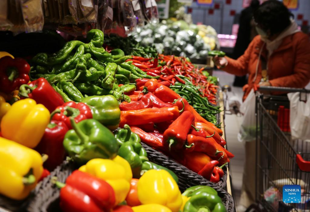 A customer selects vegetables at a market in Wuxi, east China's Jiangsu Province, Jan. 12, 2022. (Photo by Huan Yueliang/Xinhua)