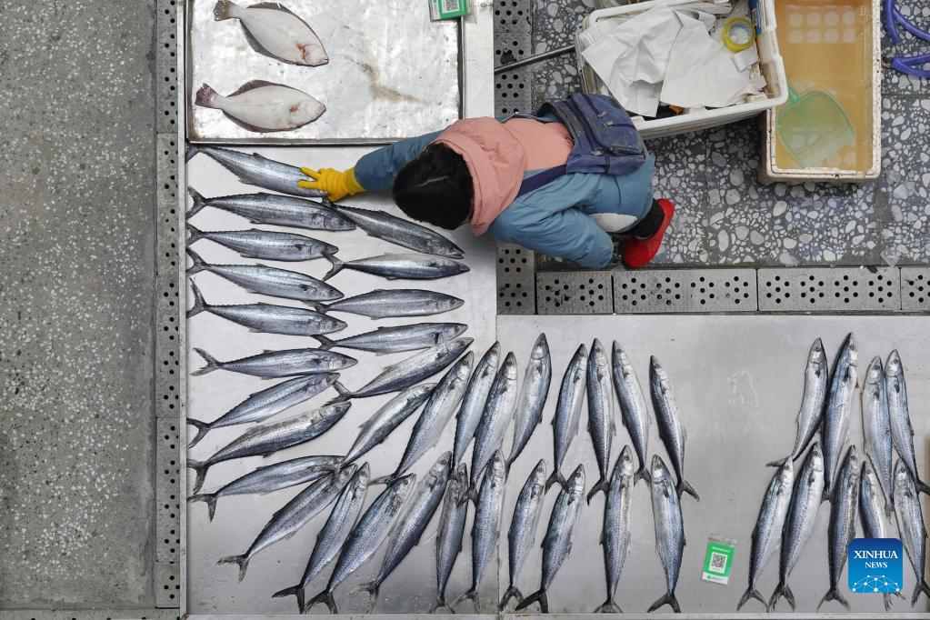 A vendor arranges seafood at a market in Yantai, east China's Shandong Province, Jan. 12, 2022. (Photo by Tang Ke/Xinhua)