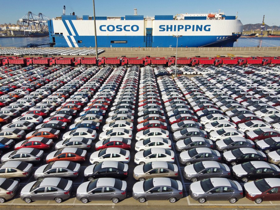 Aerial photo taken on Dec. 7, 2021 shows vehicles before being loaded onto a freight ship at Yantai Port, east China's Shandong Province. (Photo by Tang Ke/Xinhua)