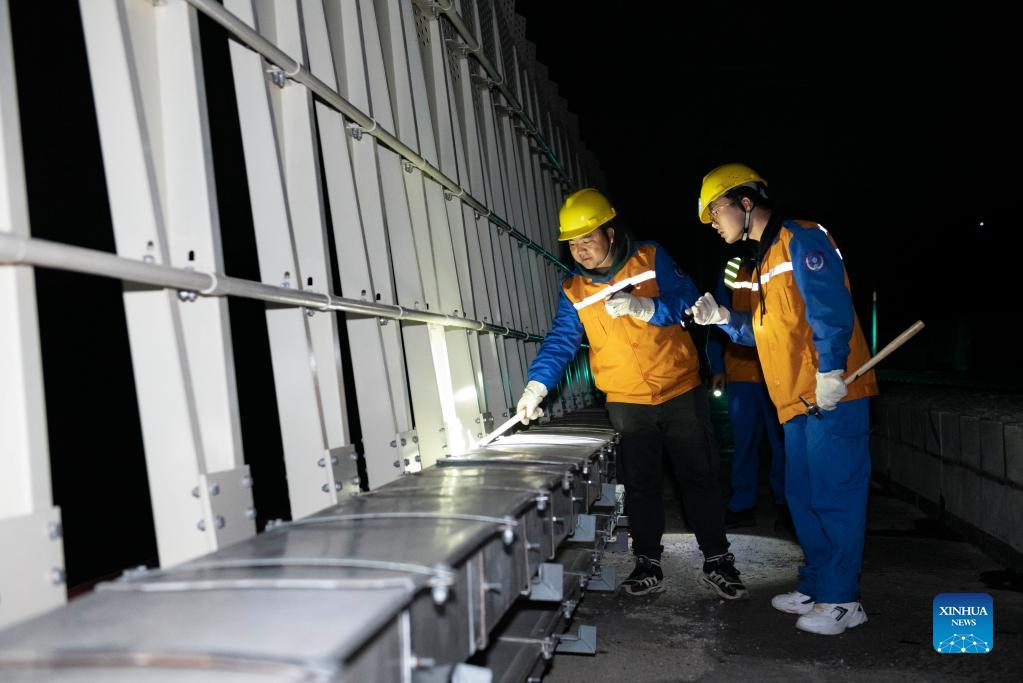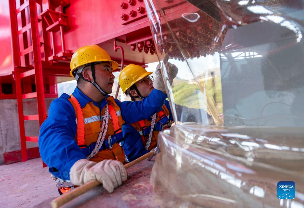 Shi Pengbin and his colleague check the bearing of Yuanjiang major bridge over the Yuanjiang River in southwest China's Yunnan Province, Jan. 18, 2022. Shi Pengbin, 28, is a technician responsible for maintaining the Yuanjiang major bridge, a key bridge of the China-Laos Railway project. Spanning a full length of 832.2 meters, the Yuanjiang bridge uses six bridge piers with the No.3 bridge pier, the highest pier, standing at 154 meters. Shi, who started working for the construction of the China-Laos Railway from April 2020, even postponed his wedding to guarantee on-time completion of the bridge. After the operation of China-Laos Railway, Shi's work includes checking the bridge in high places during the day, and repairing the bridge floor during the break time for rail service at night. During this year's Spring Festival holiday, Shi and his colleagues will stick to their posts to secure the railway transportation. (Xinhua/Chen Xinbo)
