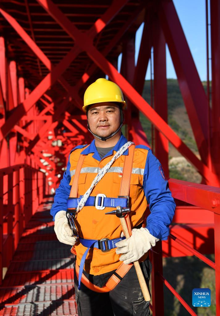 Shi Pengbin poses for a photo on the Yuanjiang major bridge over the Yuanjiang River in southwest China's Yunnan Province, Jan. 18, 2022. Shi Pengbin, 28, is a technician responsible for maintaining the Yuanjiang major bridge, a key bridge of the China-Laos Railway project. Spanning a full length of 832.2 meters, the Yuanjiang bridge uses six bridge piers with the No.3 bridge pier, the highest pier, standing at 154 meters. Shi, who started working for the construction of the China-Laos Railway from April 2020, even postponed his wedding to guarantee on-time completion of the bridge. After the operation of China-Laos Railway, Shi's work includes checking the bridge in high places during the day, and repairing the bridge floor during the break time for rail service at night. During this year's Spring Festival holiday, Shi and his colleagues will stick to their posts to secure the railway transportation. (Xinhua/Chen Xinbo)