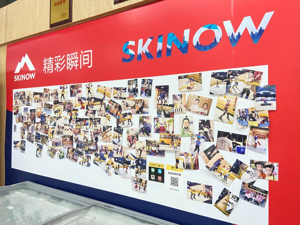 Photos of learners are seen on a wall of an indoor skiing training field Skinow in Haikou, capital of south China's Hainan Province, Jan. 15, 2022. (Xinhua/Chen Ziwei)