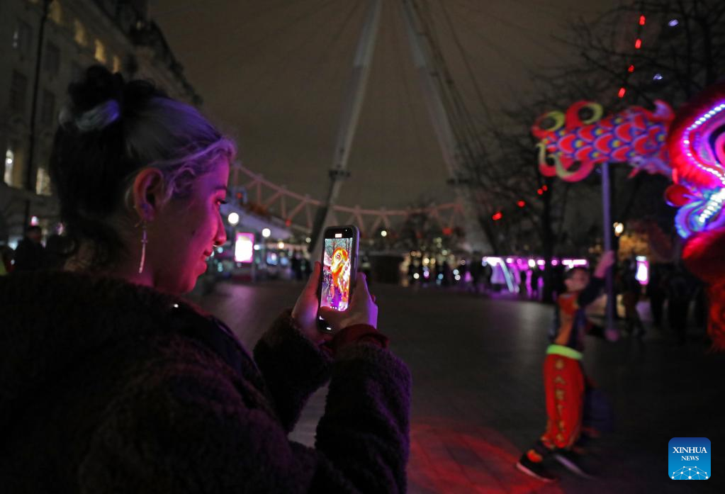 A woman takes photos of traditional Chinese drangon dance in front of the London Eye which is lit up in red to celebrate the upcoming Chinese New Year in London, Britain, on Jan. 28, 2022. (Xinhua/Li Ying)