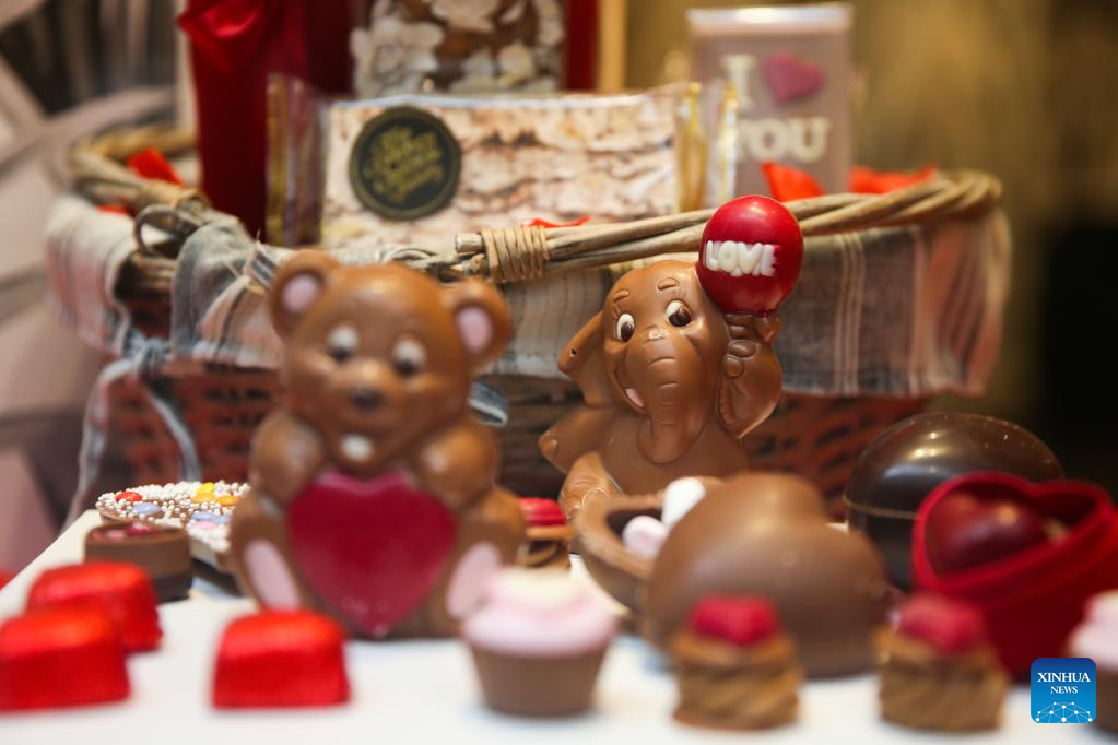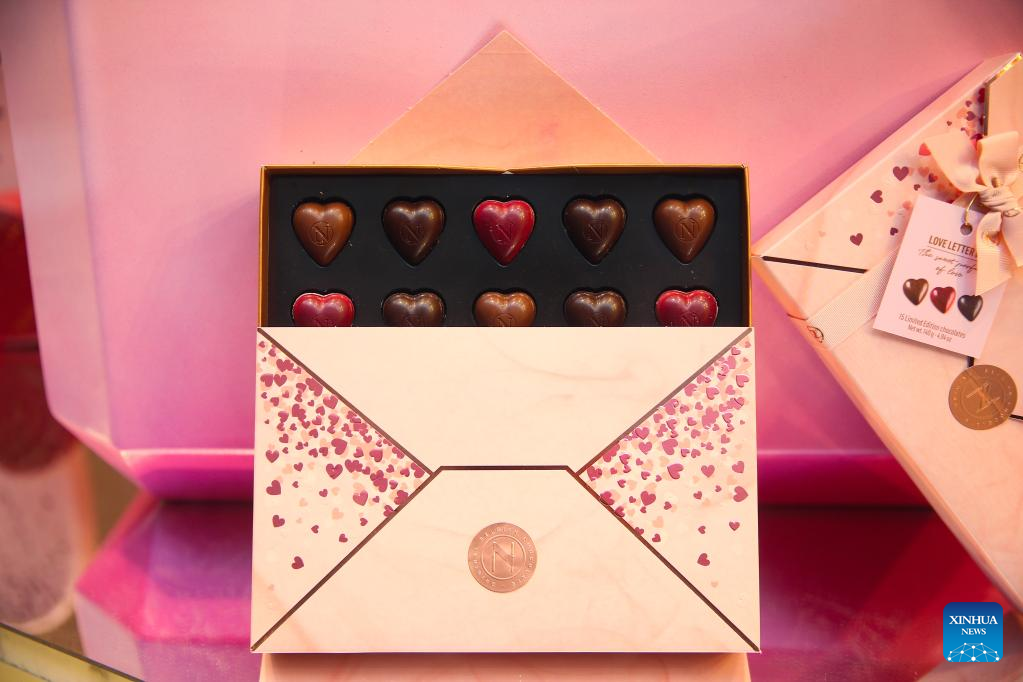 Chocolates in the theme of Valentine's Day are seen at a shop in Brussels, Belgium, Feb. 8, 2022. As the Valentine's Day approaches, new products by Belgian chocolate manufacturers have been put into market to attract shoppers. (Xinhua/Zheng Huansong)