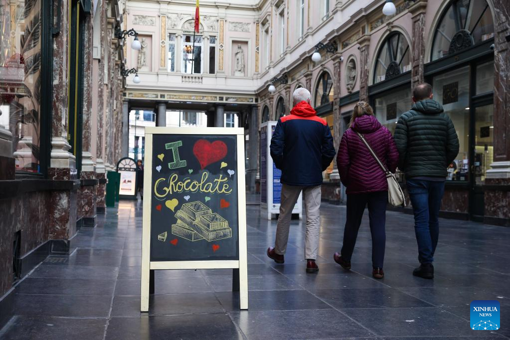 Pedestrians walk past an advertisement board of a chocolate shop in Brussels, Belgium, Feb. 8, 2022. As the Valentine's Day approaches, new products by Belgian chocolate manufacturers have been put into market to attract shoppers. (Xinhua/Zheng Huansong)