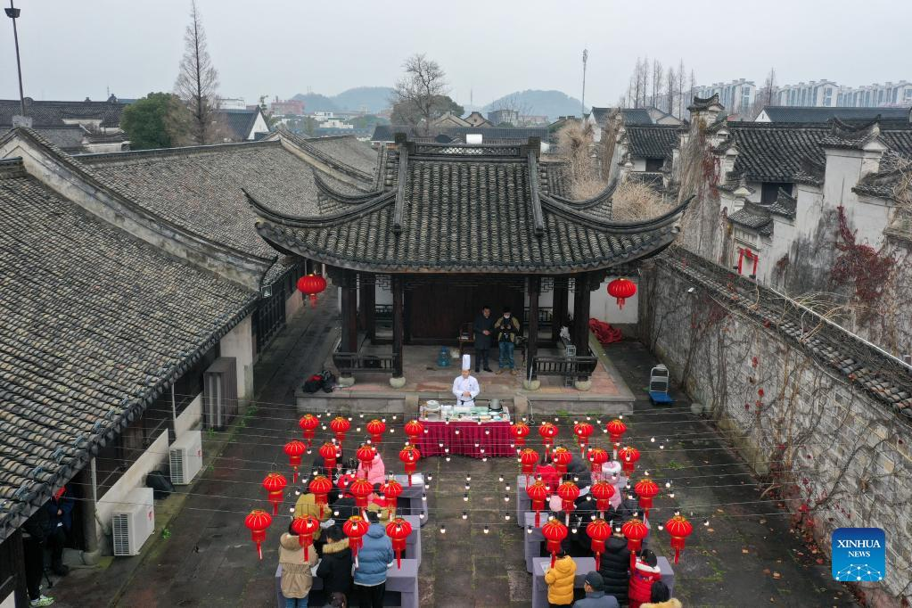 Aerial photo taken on Feb. 10, 2022 shows an event in celebration of the upcoming Lantern Festival in Zhenhai District of Ningbo, east China's Zhejiang Province. Various events are held across China to celebrate the upcoming Lantern Festival. (Photo by Hu Xuejun/Xinhua)